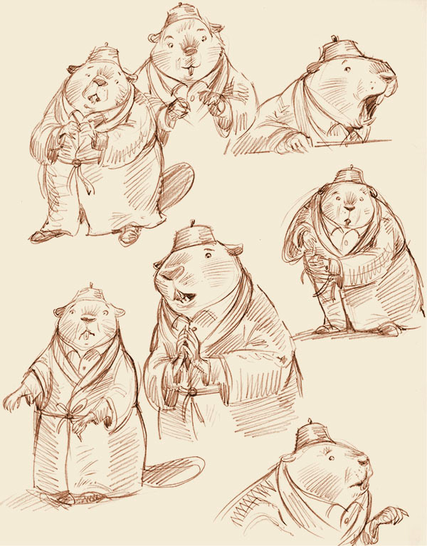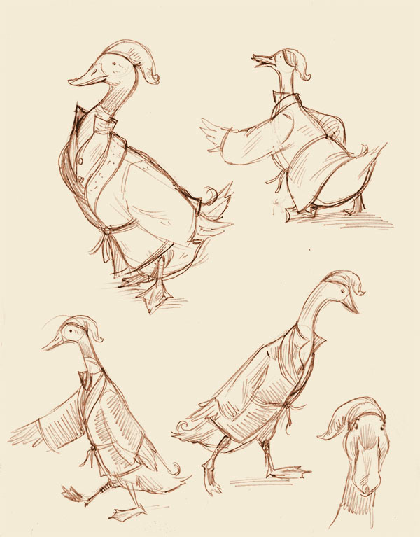 Preliminary character designs of a beaver and a mallard duck with various poses and facial expressions.