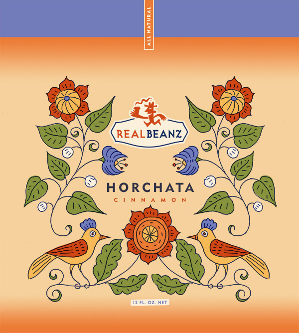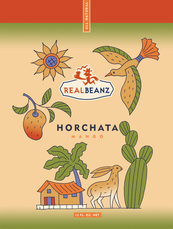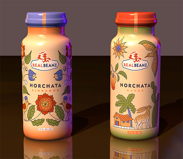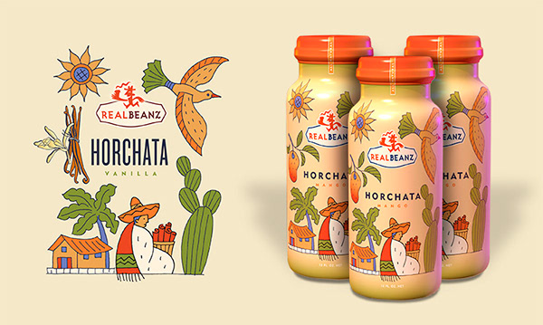 Bottle labels for flavored horchata, a traditional beverage made from ground almonds, sesame seeds, rice, barley, or tigernuts, especially popular in Latin American countries.