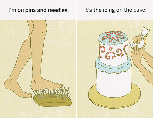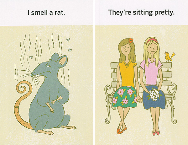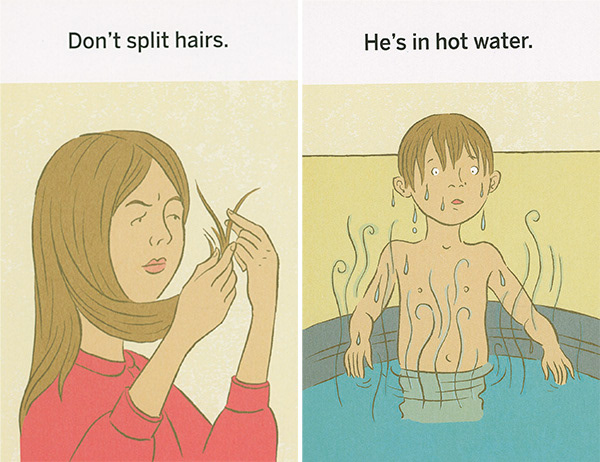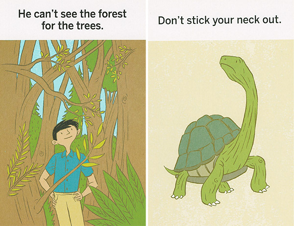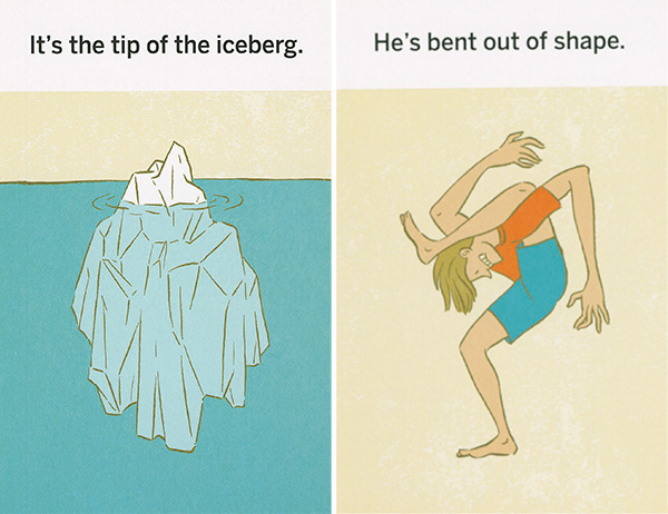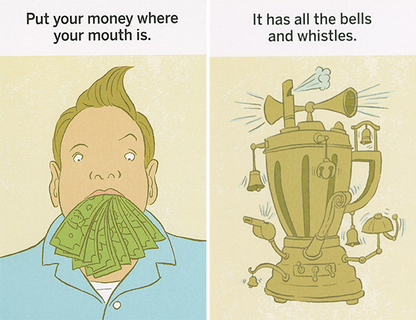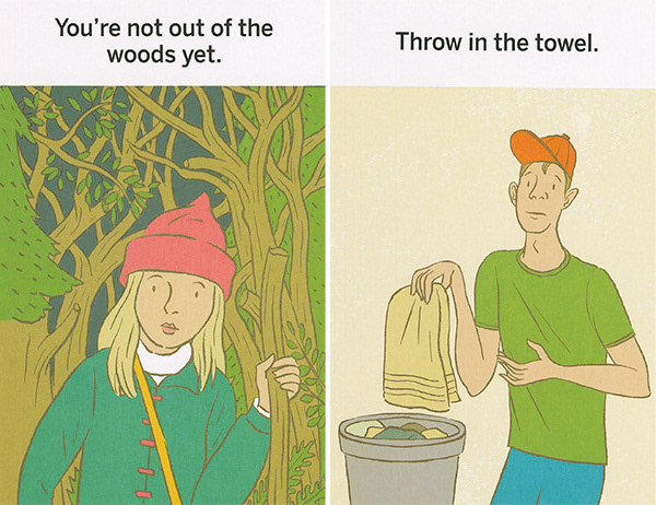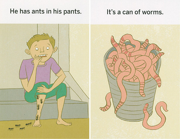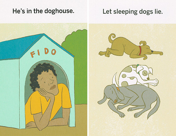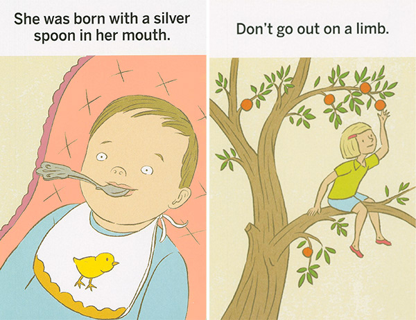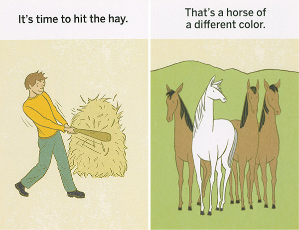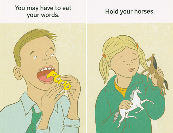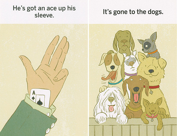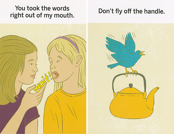 These illustrations were created for "What the Heck Does That Mean," a series of games using picture cards that teach literal thinkers, kids with ASD, and non-native speakers the meanings of idioms. The often-comical literal translation of each phrase is shown on the front of each card. The concept was developed by Western Psychological Services and is sold at the Creative Therapy Store. Art direction by Stacy Messerschmidt.