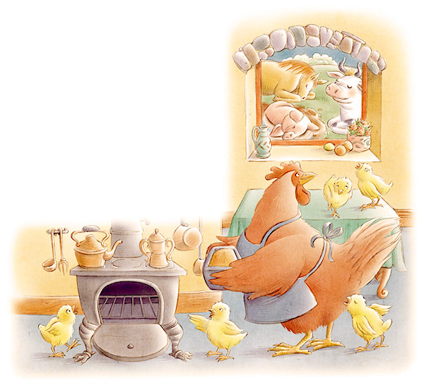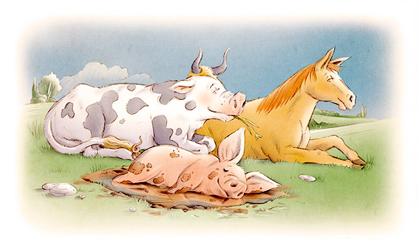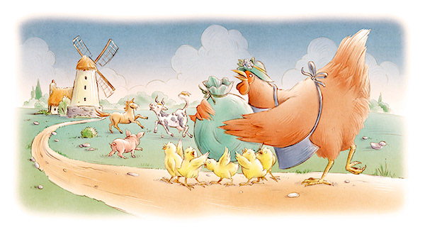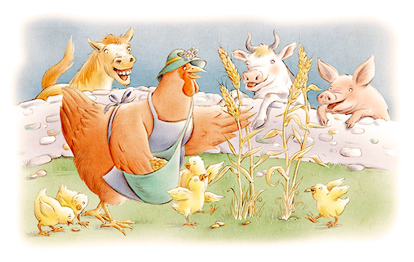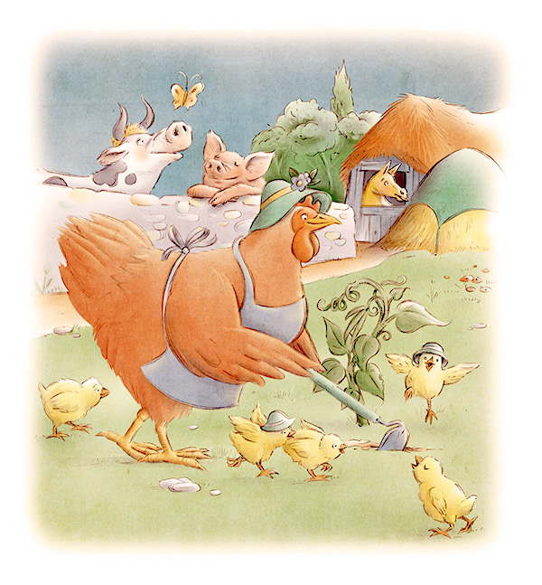 Children's picture book illustrations, rendered in pencil with digital coloring, portray the classic fairy tale.