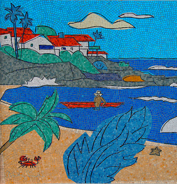 Smalti glass and marble mosaic, 40'x6.5', depicting "A Day at the Beach" installed in terminal one of the San Diego International Airport.